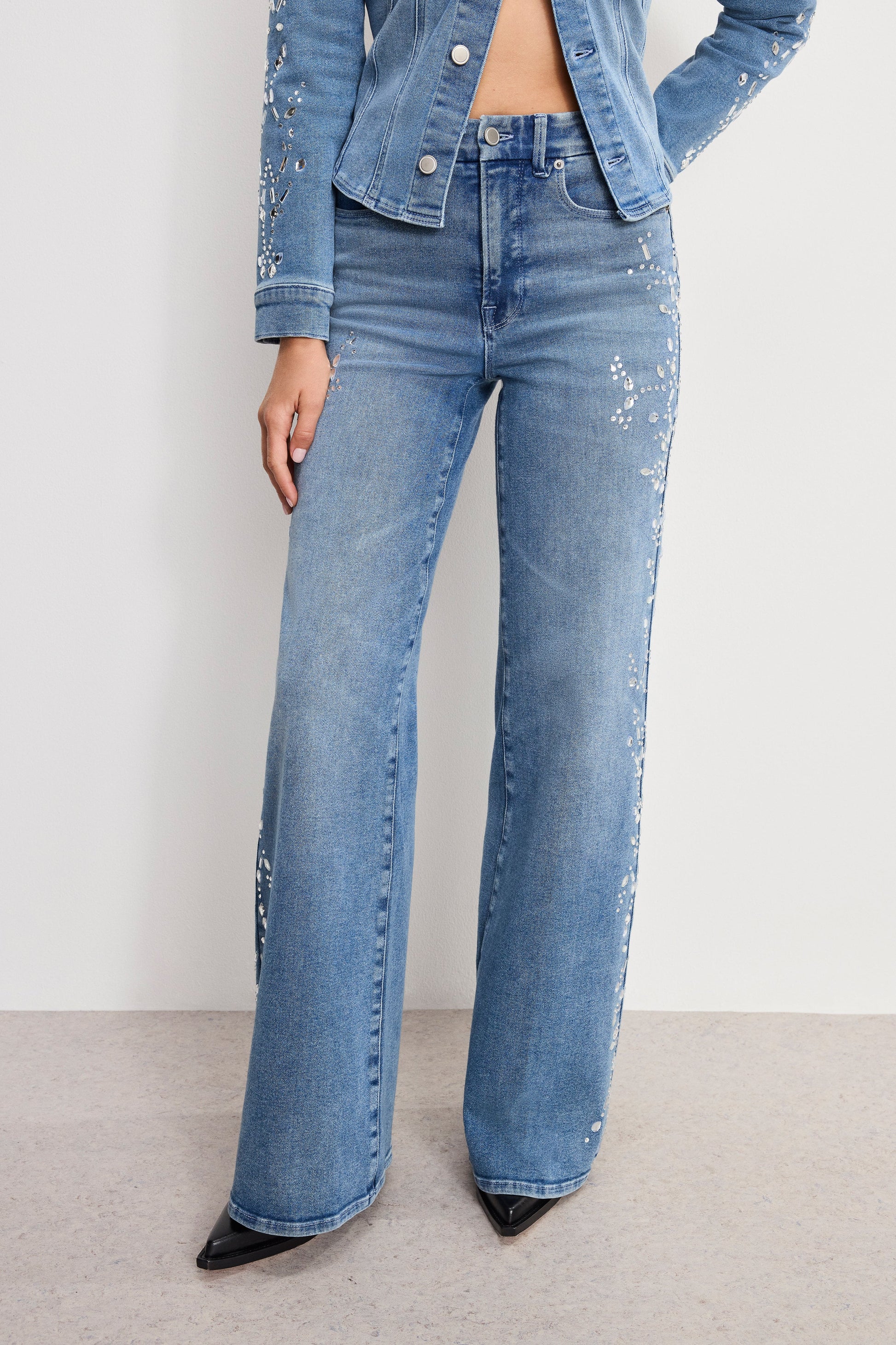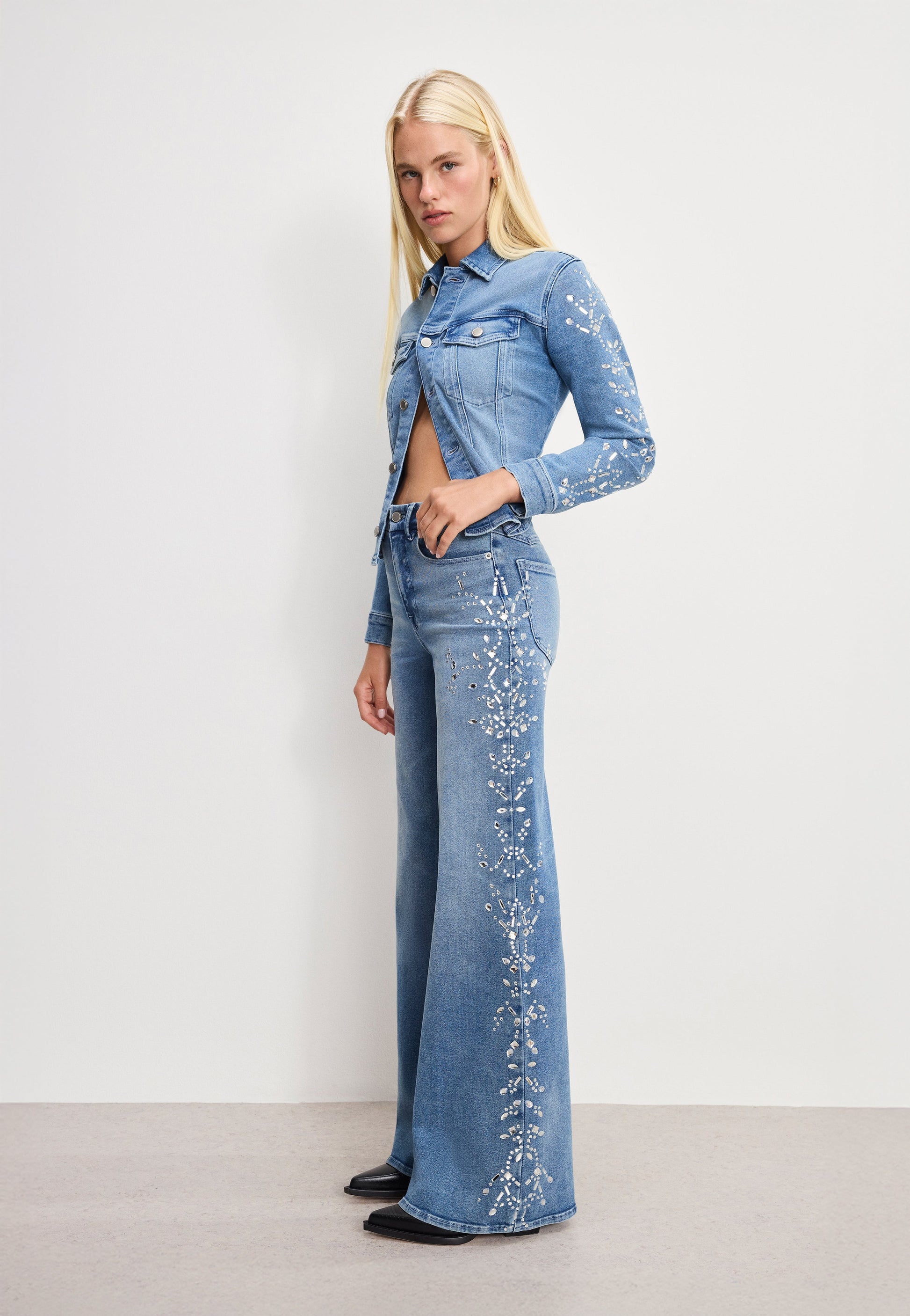 Crystal detailing along the sides give these wide-leg classics a flash of Dolly's unmistakable glam, while the clean silhouette keeps it effortlessly cool. Perfect for dancing, walking tall, or stealing the scene.